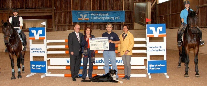 Die Volksbank Ludwigsburg unterstützt den Reit- und Fahrverein Bottwartal e.V. bei der Anschaffung eines neuen Hindernisses für den Springparcours: Privatkundendirektor Klaus-Dieter Walther und die Großbottwarer Filialleiterin Claudia Bärwald-Schwarz haben dem Vereinsvorsitzenden Andreas Keuser und Reitlehrerin Inge Pfeiffer eine Spende in Höhe von 1.800 Euro überreicht.