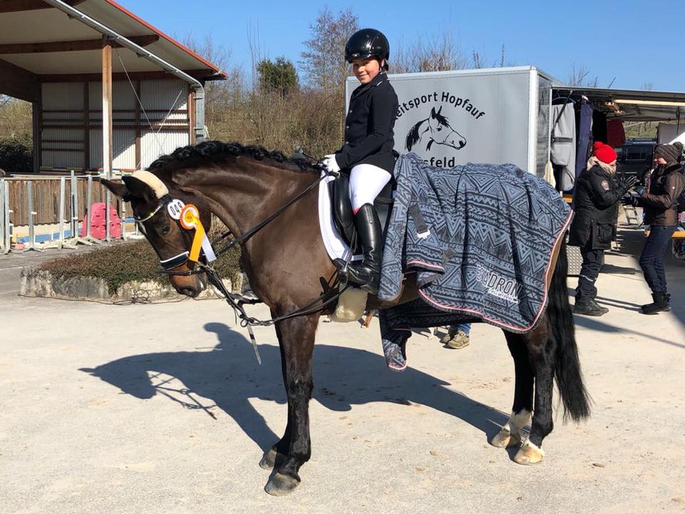 eröffnet dieses Jahr unsere Turniersaison mit ihrer frisch in ihr Eigentum übergangenen Desert Rose die von ihr liebevoll „Rosi“ genannt wird. Dieser Turnierstart und der 1. Turnierstart in ihrer gemeinsamen Karriere hätte besser nicht sein können. Sieg im Reiterwettbewerb in Weinsberg. Herzlichen Glückwunsch Hannah, zum Sieg und zu deiner Rosi