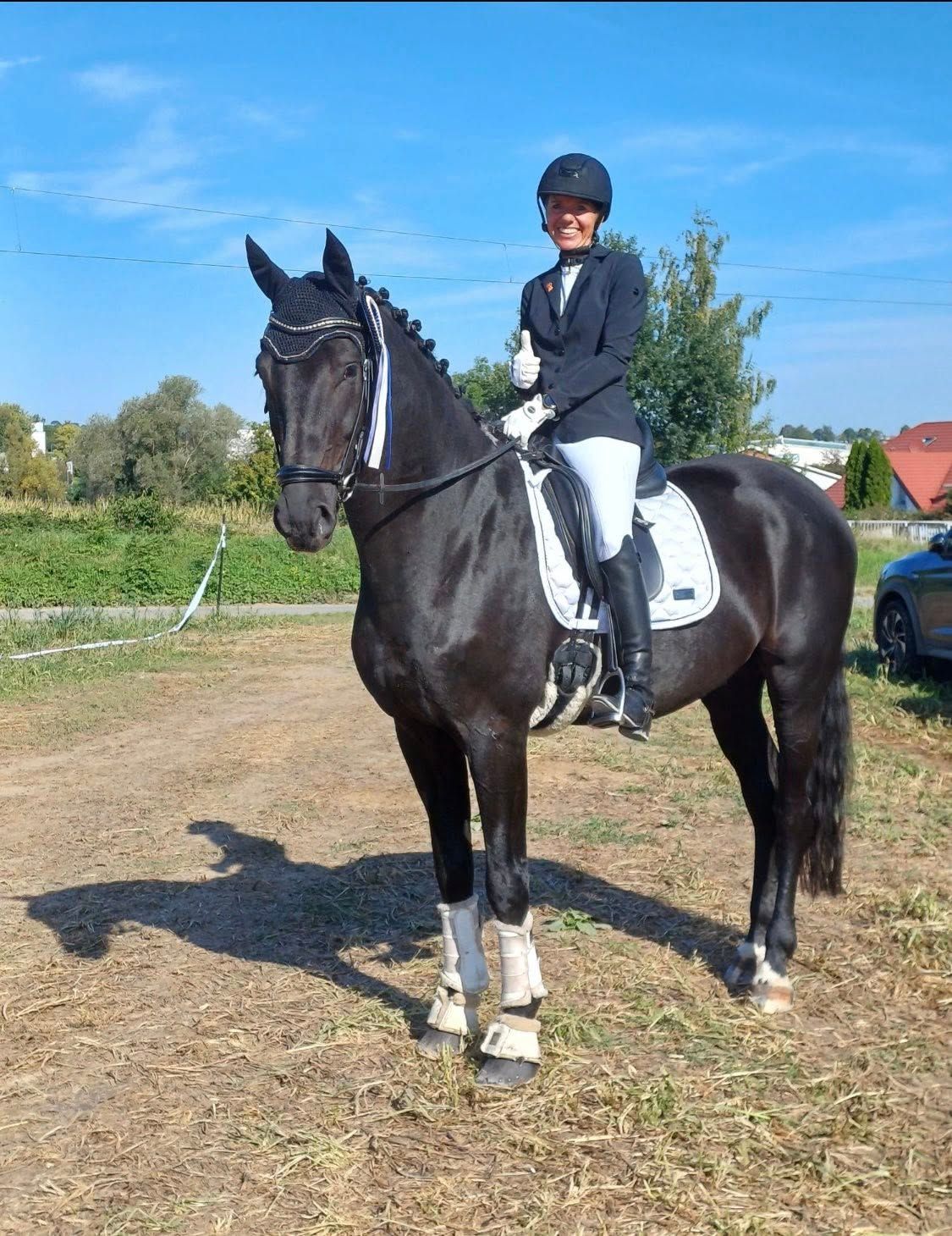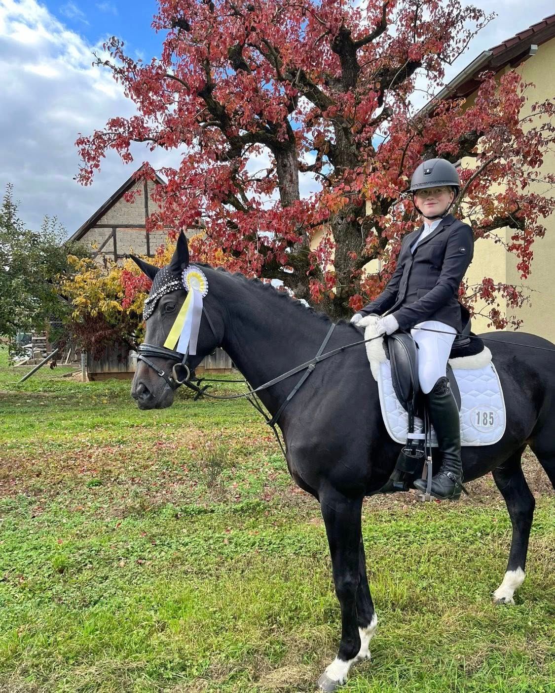 Ein breites Grinsen im Gesicht. Eine tolle Erfahrung reicher. Einen Haufen Teamgeist. Das brachte Charlotte aus Darmstadt mit nach Hause und wir könnten nicht stolzer sein. Seit sie sich beim Auswahllehrgang in Warendorf beweisen konnte, war dieses Wochenende in ihrem Kalender rot markiert: das Bundesnachwuchschampionat der Pony-Dressur. 154 km sind die 12-jährige und ihre treue Fellnase Eddie gereist, um einmal mehr zu zeigen, was sie können. Im Handgepäck: der engste Fanclub und ein Haufen gedrückter Daumen aus Großbottwar. Die Nervosität ließ sich trotzdem nicht abschütteln – ganz verständlich bei einer so einmaligen Einladung. Am Samstag tanzen Eddies Hufe dann motiviert in der ersten L-Dressurprüfung des Wochenendes über den Platz. Zwei technische Patzer bringen Charlotte zunächst ins hintere Mittelfeld des Turniers. Die Enttäuschung war zunächst groß, aber kurze Zeit später war sie wieder fest entschlossen am Sonntag nochmal alles zu geben. An diesem folgt die zweite L-Dressurprüfung, Eddie und Charlotte geben ihr Bestes, können sich steigern und meistern trotz eines kleinen Fehlers eine gute und flüssige Runde. Charlotte wurde von den Richtern für eine schwungvolle Vorstellung mit einem kooperativen Pony gelobt. Man wünschte sich jedoch noch mehr Lockerheit/Losgelassenheit bei der Reiterin, so dass das Einwirken noch geschmeidiger wird. Daran wird gearbeitet💪🏼. So reichte es am 2. Tag für den ersten Reserveplatz! Über mehrere Wochen und in verschiedenen Auswahlrunden konnte Charlotte immer wieder ihr Talent unter Beweis stellen und auch, wenn es im Finale nicht ganz zu den Top 10 gereicht hat, könnten wir doch nicht stolzer sein, dass sie es in so jungen Jahren schon so weit geschafft hat. Wir sind gespannt, was uns die nächsten Jahre erwartet! Wir gratulieren herzlich der Gewinnerin Franka Müller aus Baden-Württemberg und bedanken uns für ein Wochenende voller Teamgeist, Aufregung aber auch Spaß, das unsere Charlotte miterleben durfte.