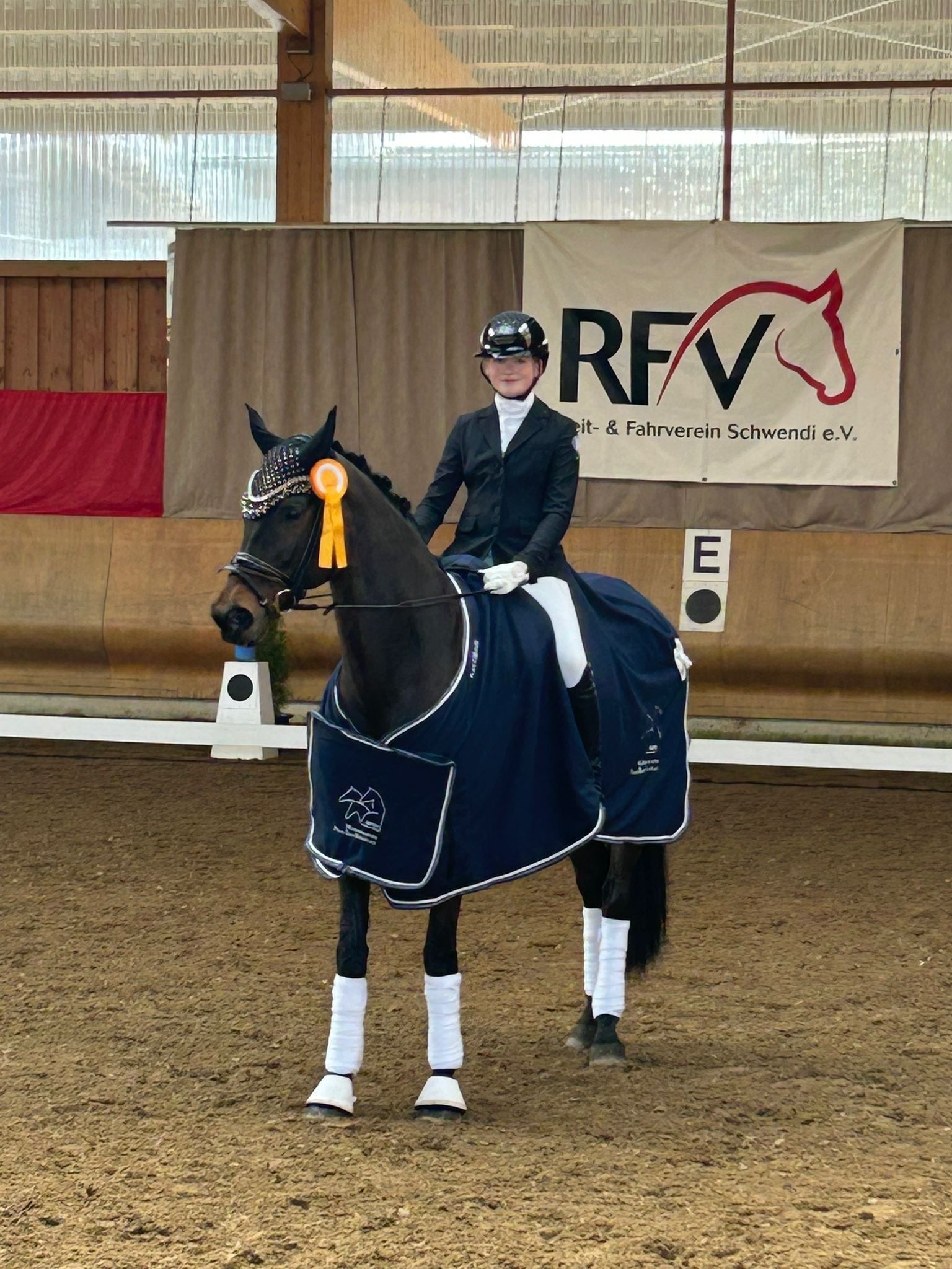 Den Auftakt machte Emmi in der A-Dressur. Mit ihrer Fedi zeigte sie eine wunderschöne Runde, bei der einfach alles zusammenpasste. Die beiden harmonierten im Viereck und wurden am Ende mit der tollen Wertnote von 7,8 belohnt – und damit auch mit dem Sieg!