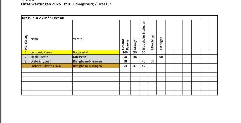 | M**-Dressur (LK 2) | 🥇 Karen – 1. Platz |